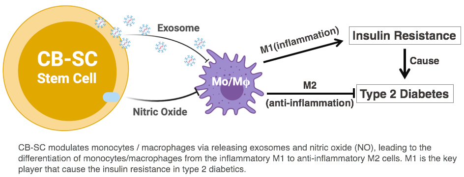 Monocytes/macrophages are important front line of immune cells in humans. Based on the phenotypic differences, macrophages are simply characterized with type 1 macrophages (M1, inflammatory) and type 2 macrophages (M2, inflammatory). Mechanistic studies have shown that the percentage of monocytes expressing an M1 macrophage marker was markedly decreased in T2D patients four weeks after Stem Cell Educator therapy and that co-culture of activated monocytes with stem cells CB-SC significantly down-regulated numbers of inflammation-related genes, including chemokines and cytokines. To further explore the molecular mechanisms underlying the immune modulation of Educator therapy on monocytes/macrophages, our recent study demonstrated that CB-SC could release exosomes (designated cbExosomes, see following Figure) that promoted the M2 differentiation of monocytes. Exosomes belong to a family of nanoparticles with diameters ranging 30‒150 nm. Thus, Stem Cell Educator therapy through the action of CB-SC counteract the chronic inflammation by releasing cbExosomes, which promote monocyte differentiation into anti-inflammatory M2 macrophages, contributing to the control of inflammation and producing the long-lasting clinical outcomes in metabolic control for individuals with moderate or severe T2D who receive a single treatment.